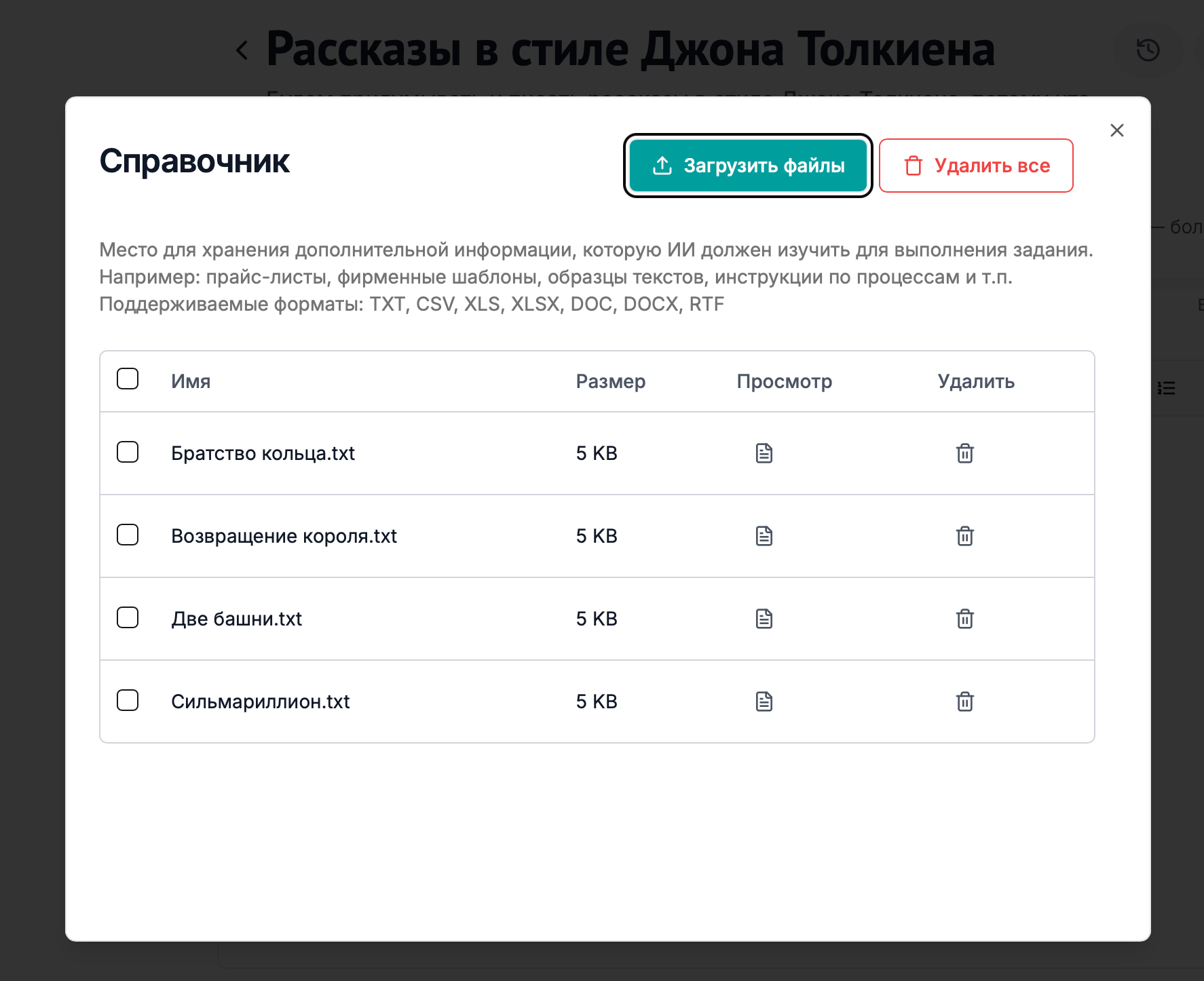 В Справочник можно загружать самые разные материалы — прайс-листы, технические характеристики устройств, корпоративные стандарты написания статей или примеры работ в нужном стиле. Чаще всего пользователи добавляют туда именно образцы текстов, чтобы ИИ мог проанализировать их структуру, лексику, интонацию и другие стилистические особенности. После этого нейросеть начинает генерировать контент, максимально приближенный к эталонным примерам.