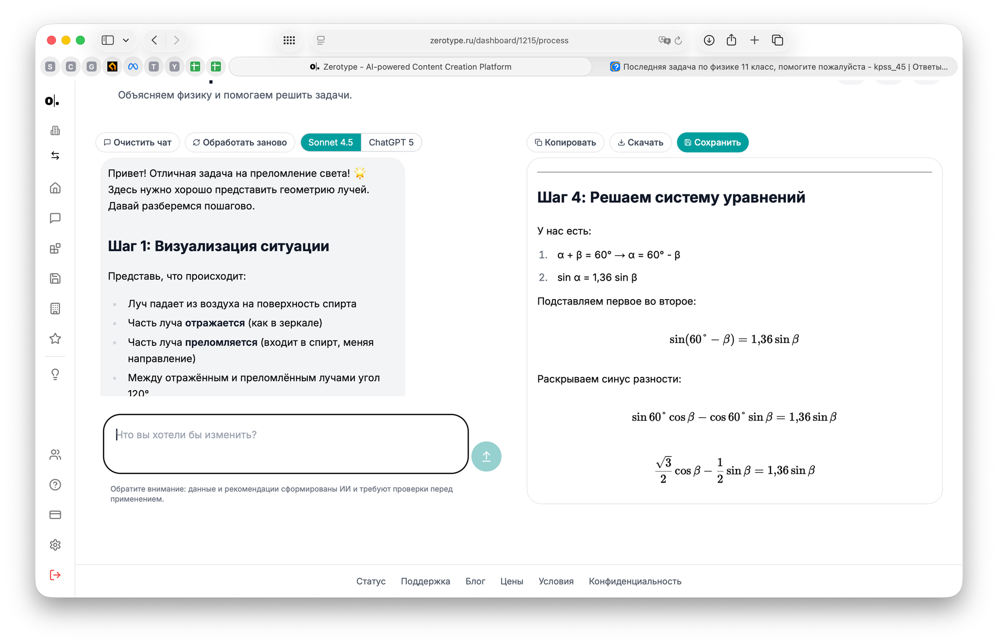 Второе обновление родилось из вполне житейской ситуации. Один наш клиент помогает ребёнку разбираться с физикой старших классов. Он создал в Zerotype специального преподавателя, который отлично объясняет сложные процессы простым языком. Всё было хорошо, пока дело не дошло до формул. Система выдавала их в виде текста, где вместо красивых дробей и степеней приходилось читать что-то вроде «x^2 + y^2 = r^2». Для взрослого человека ещё терпимо, а вот школьнику такая запись только добавляет путаницы.